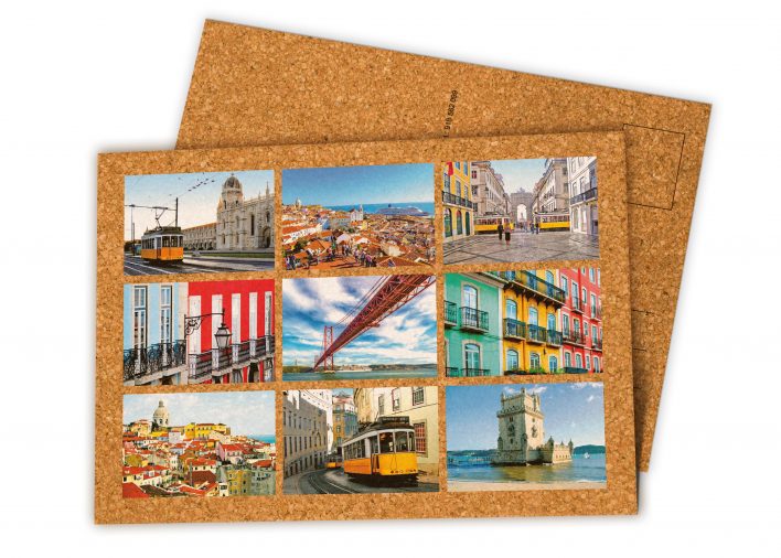 Postal de Cortiça com vistas de Lisboa.