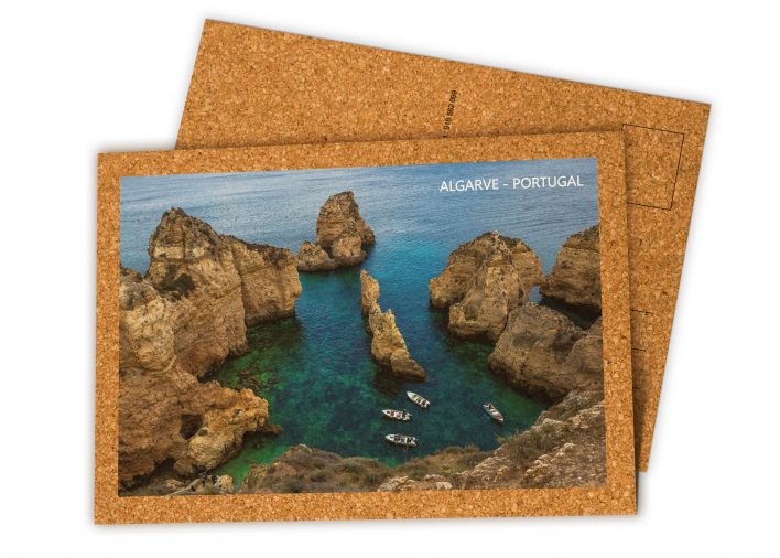 Postal de Cortiça com vista da Ponta da Piedade, em Lagos – Algarve.