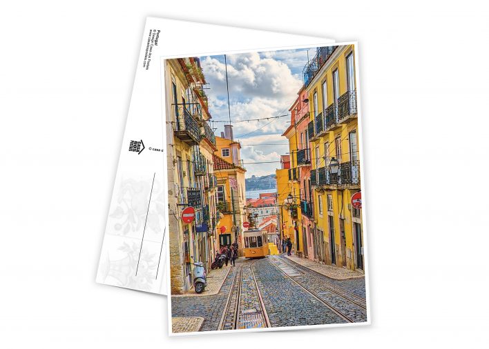 Postal das ruas de Lisboa com o elétrico.