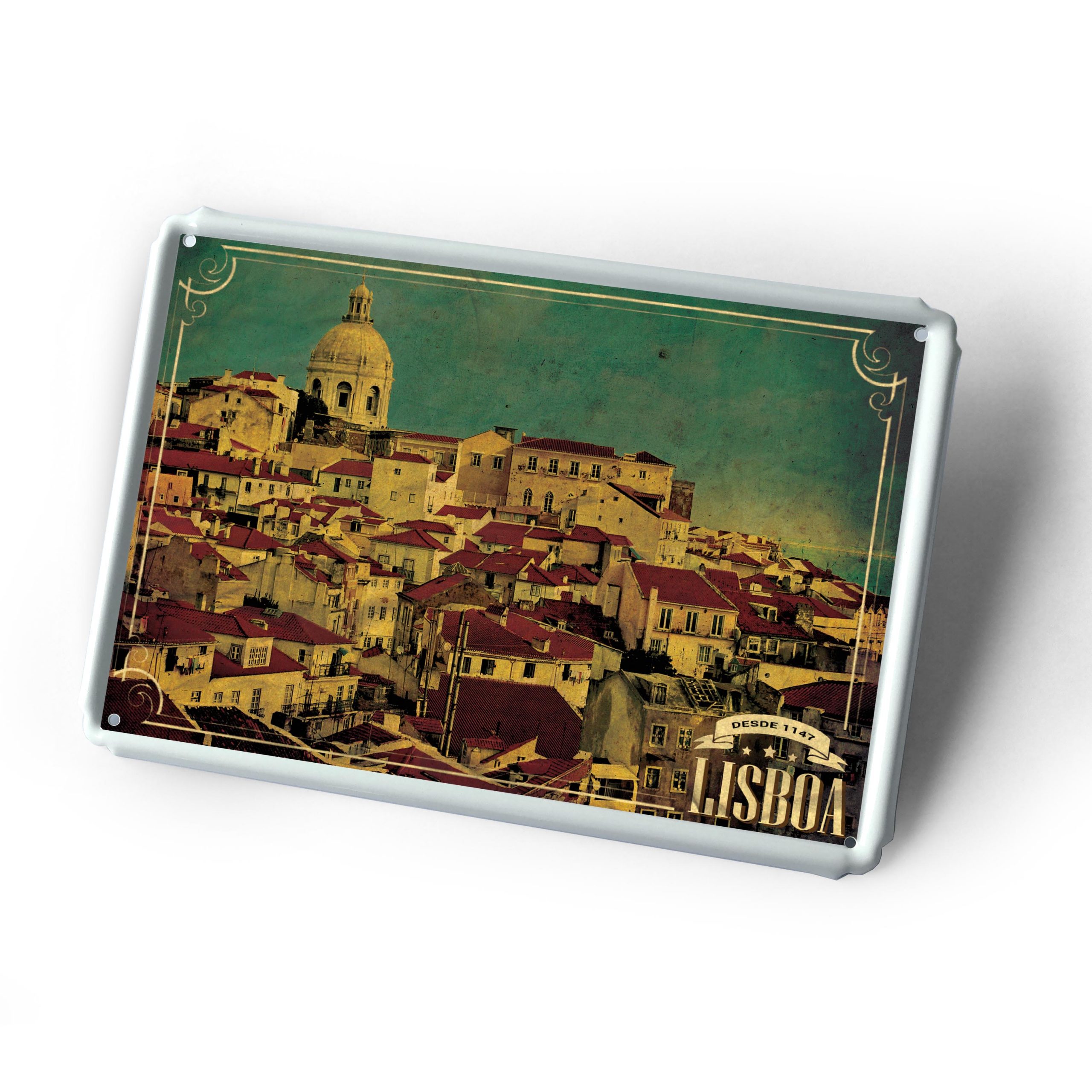 Placa metálica vintage com vista para o bairro de Alfama, em Lisboa.