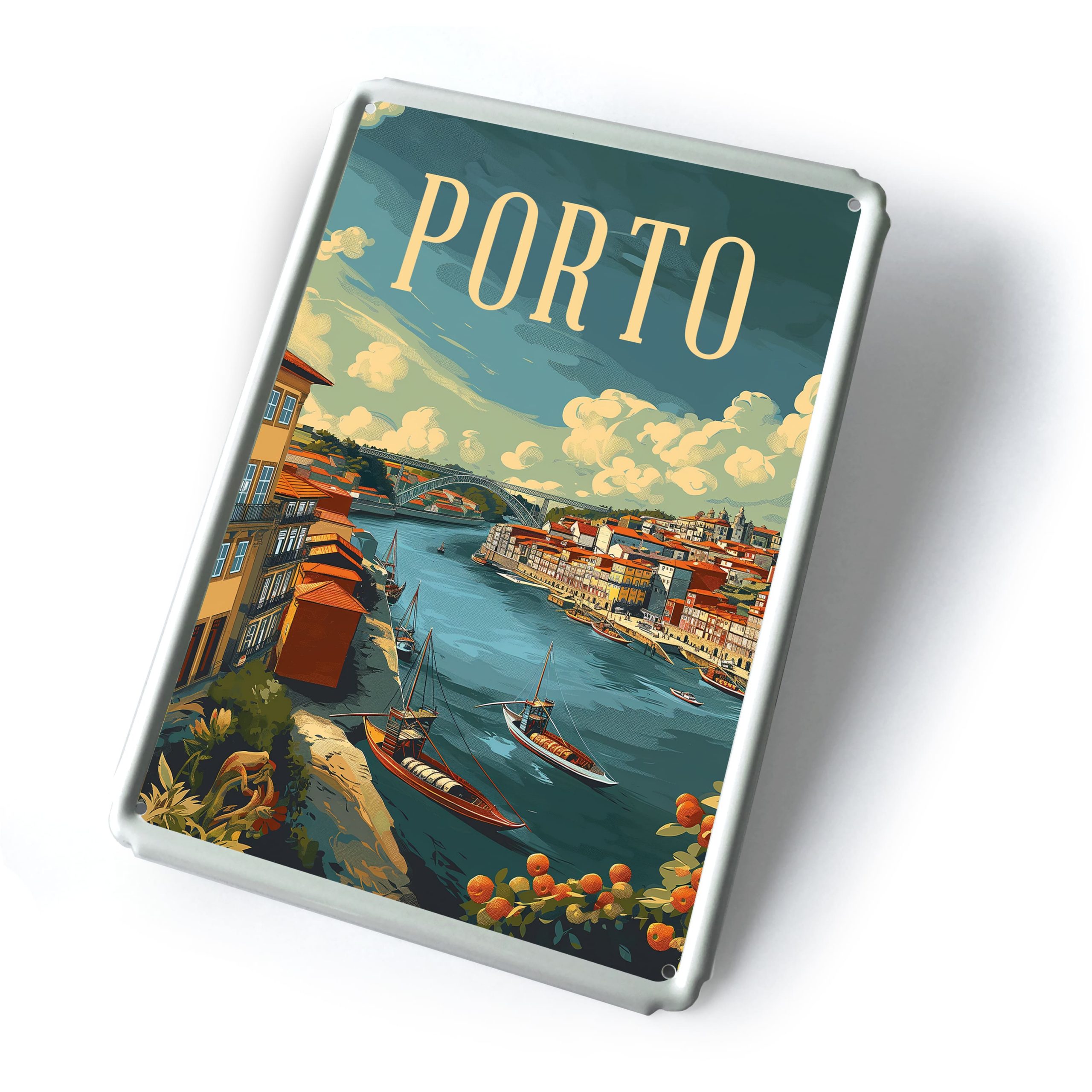Placa metálica com ilustração da cidade do Porto. Inclui furações para afixação.