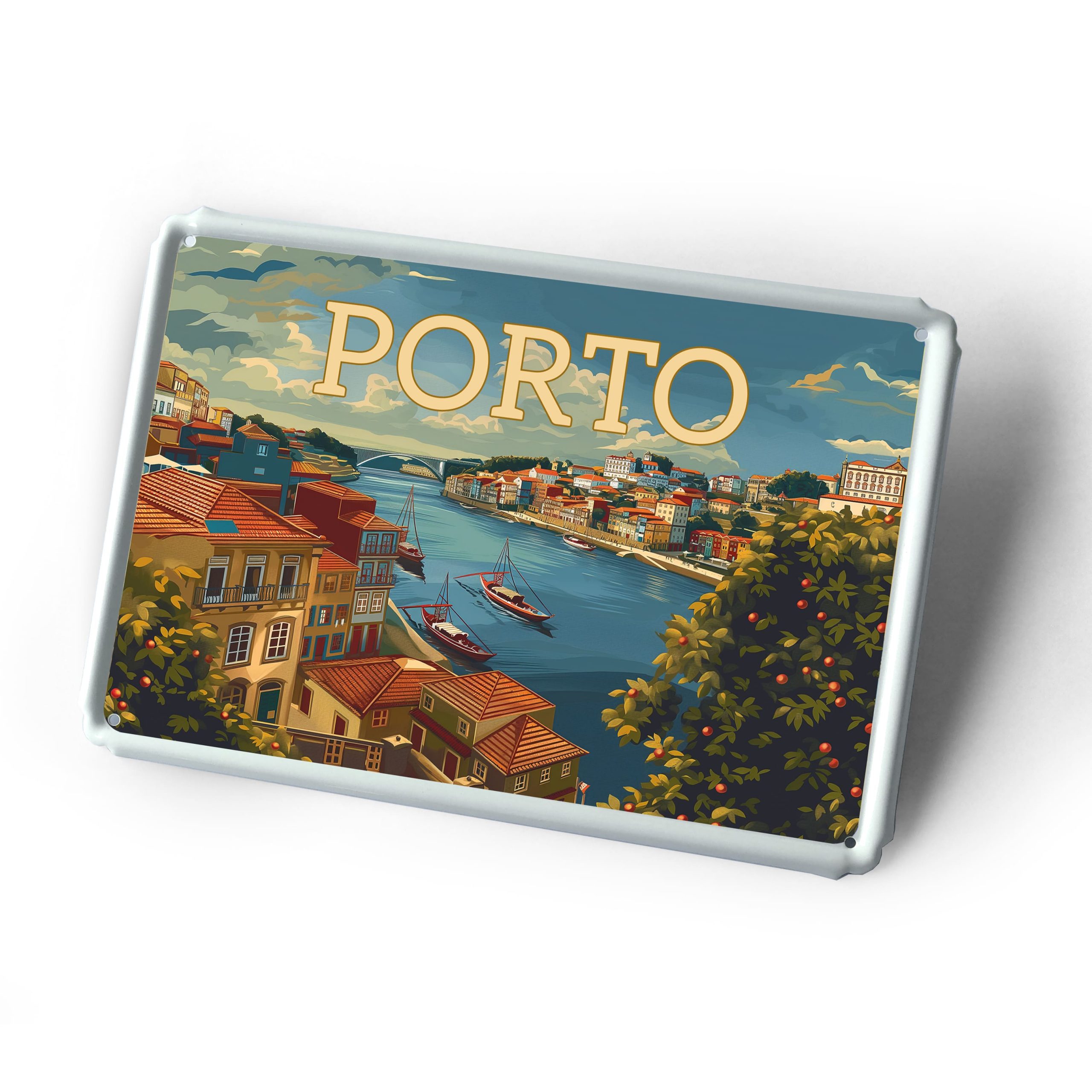 Placa metálica com ilustração da cidade do Porto. Inclui furações para afixação.