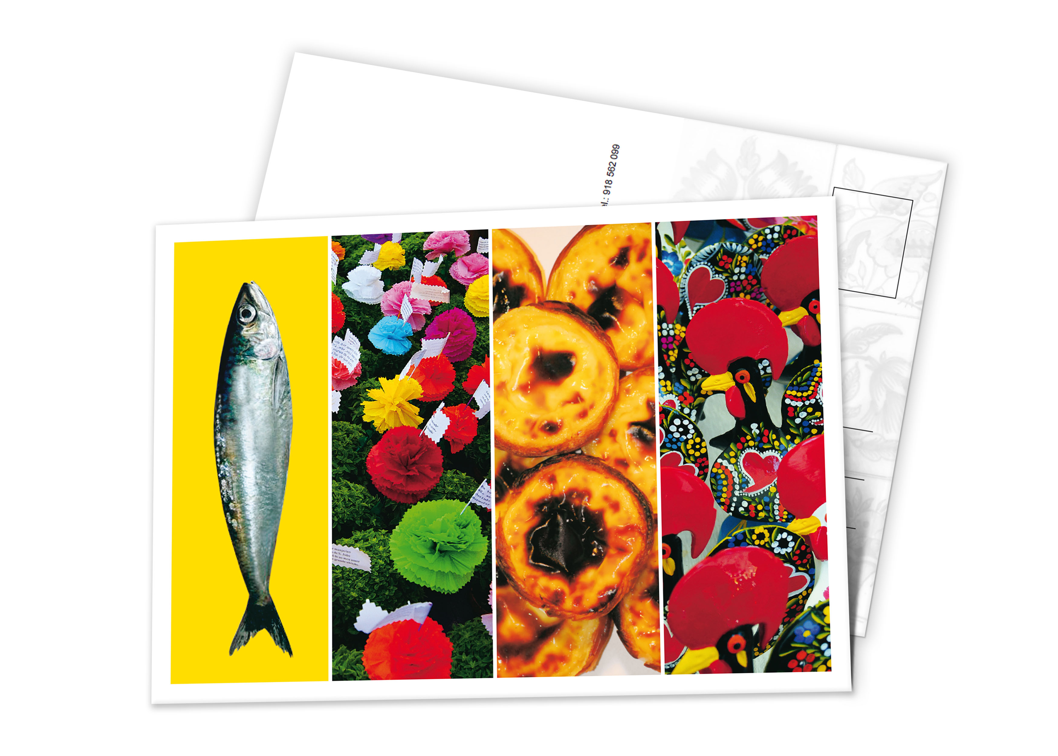 Sardinha, Manjericos, Pastel de Nata e Galos de Barcelos. Produto comercializado em múltiplos de 25 unidades para revenda e à unidade para o consumidor final.