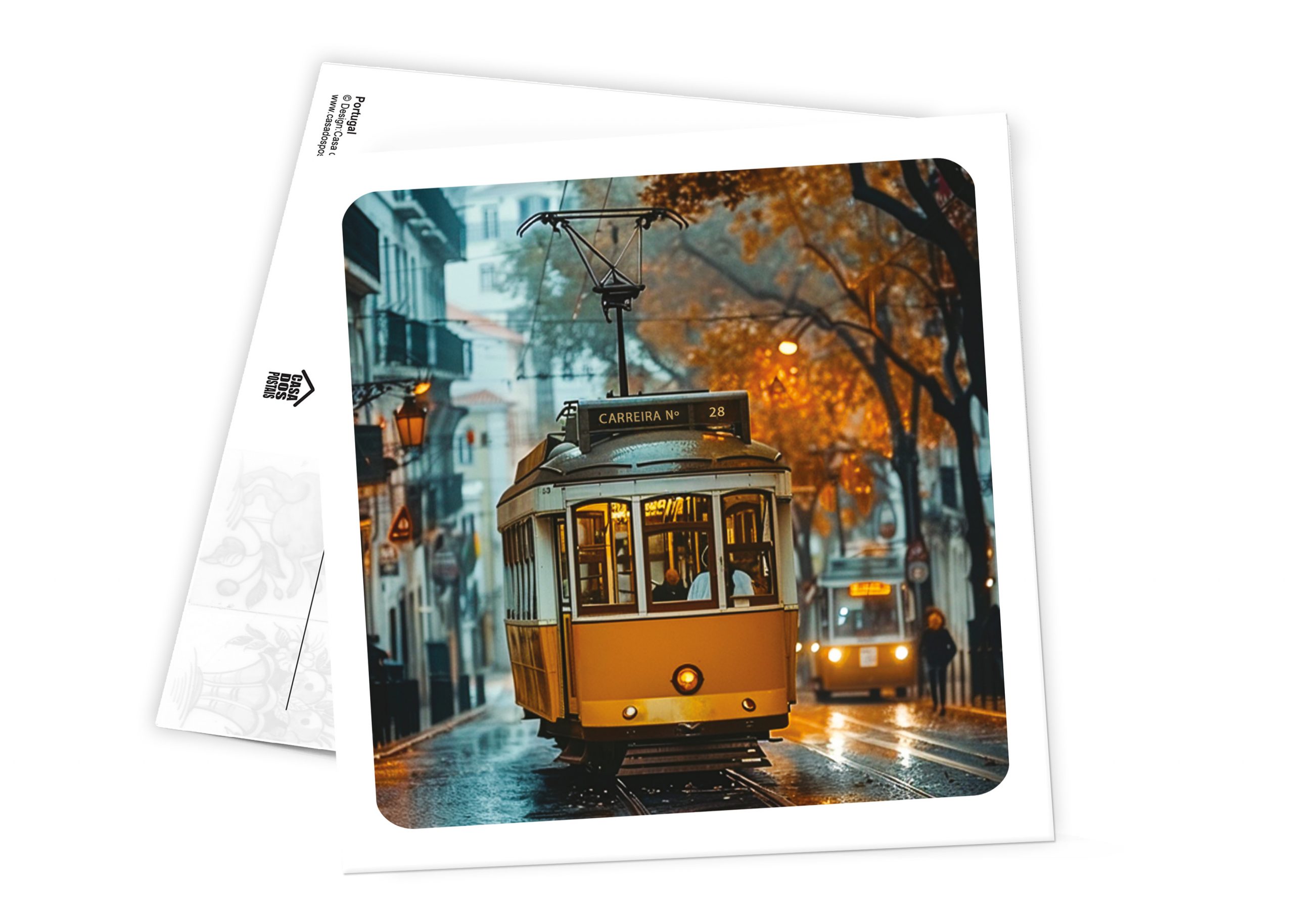 Postal Quadrado com vista do elétrico de Lisboa à noite